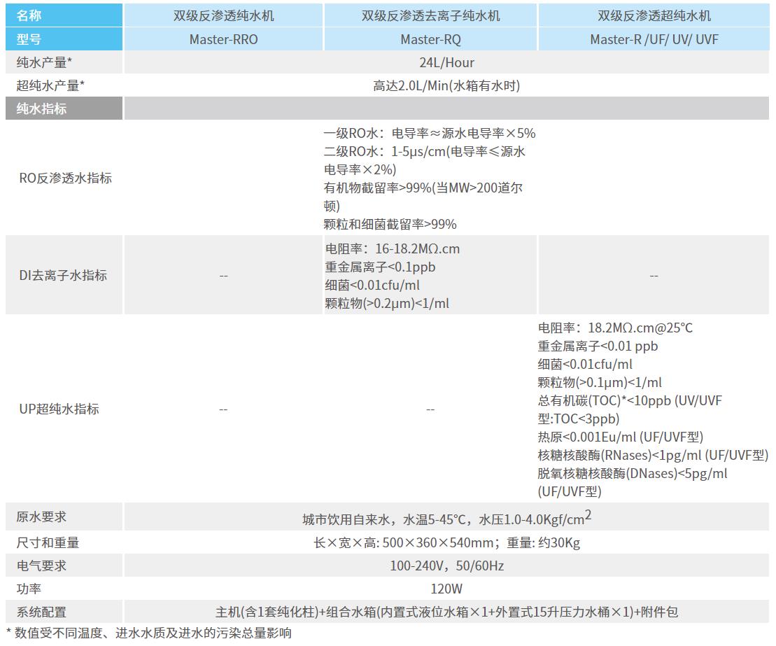 以自来水为水源,按照标准的双级反渗透工艺:双泵双膜+中间水箱(内置式)进行制造,产水量高达24升/小时,在源水水质较差的工况下,RO产水电导率同样可稳定在1-5μs/cm,与单级RO系统相比,产水质量更好,后置纯化单元的耗材使用成本更低,与简装型双级RO系统(单泵双膜无中间水箱)相比,设计更合理,产水质量更稳定,尤其适用于源水电导率或硬度较高的区域。