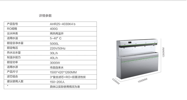 龙头数量:4龙头 出水种类:两开两温开 额定容量:25L 制温开水能力:120L/h 制开水能力:30L/h 额定功率:3000W 尺寸(宽*厚*高mm):1500*420*1260