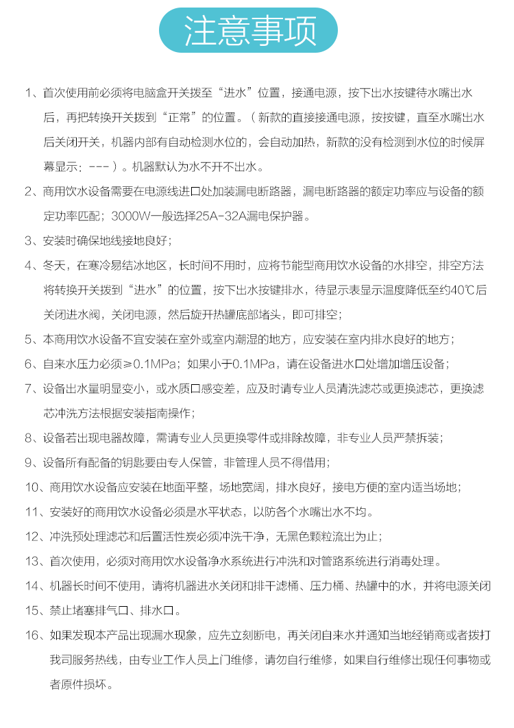 龙头数量:3龙头 出水种类:一开两温开 滤芯组合:3*复合滤芯+RO膜+活性炭 RO规格:63L/h 额定容量:25L 制开水能力:30L/h 制温开水能力:40L/h 额定电压:220V/50HZ 额定功率:3000W 尺寸(宽*厚*高mm):1100*420*1260