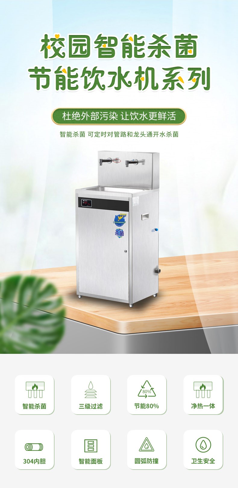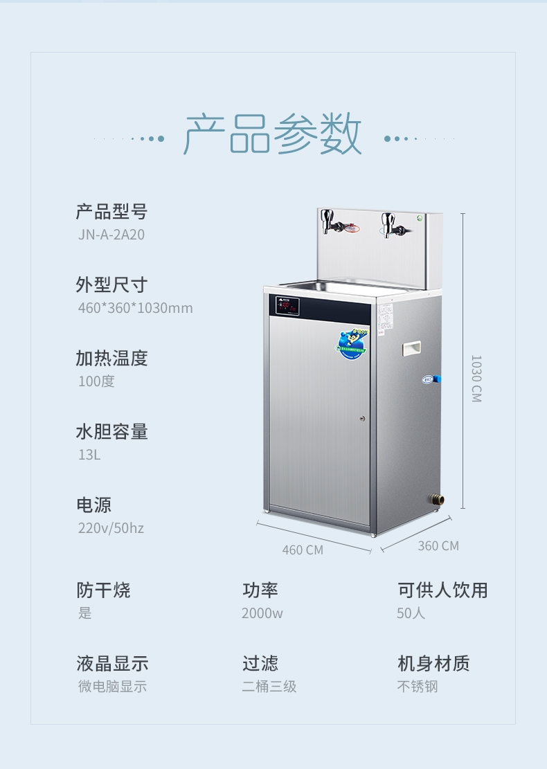 电源 : 220V/50Hz 额定功率 : 2000W 水胆容量 : 15L 制开水: 20L/H 制温开水 : 60L/H 过滤系统 : 二桶三级 适用人数 : 50人 箱体尺寸LxWxH : 460x360x1025mm