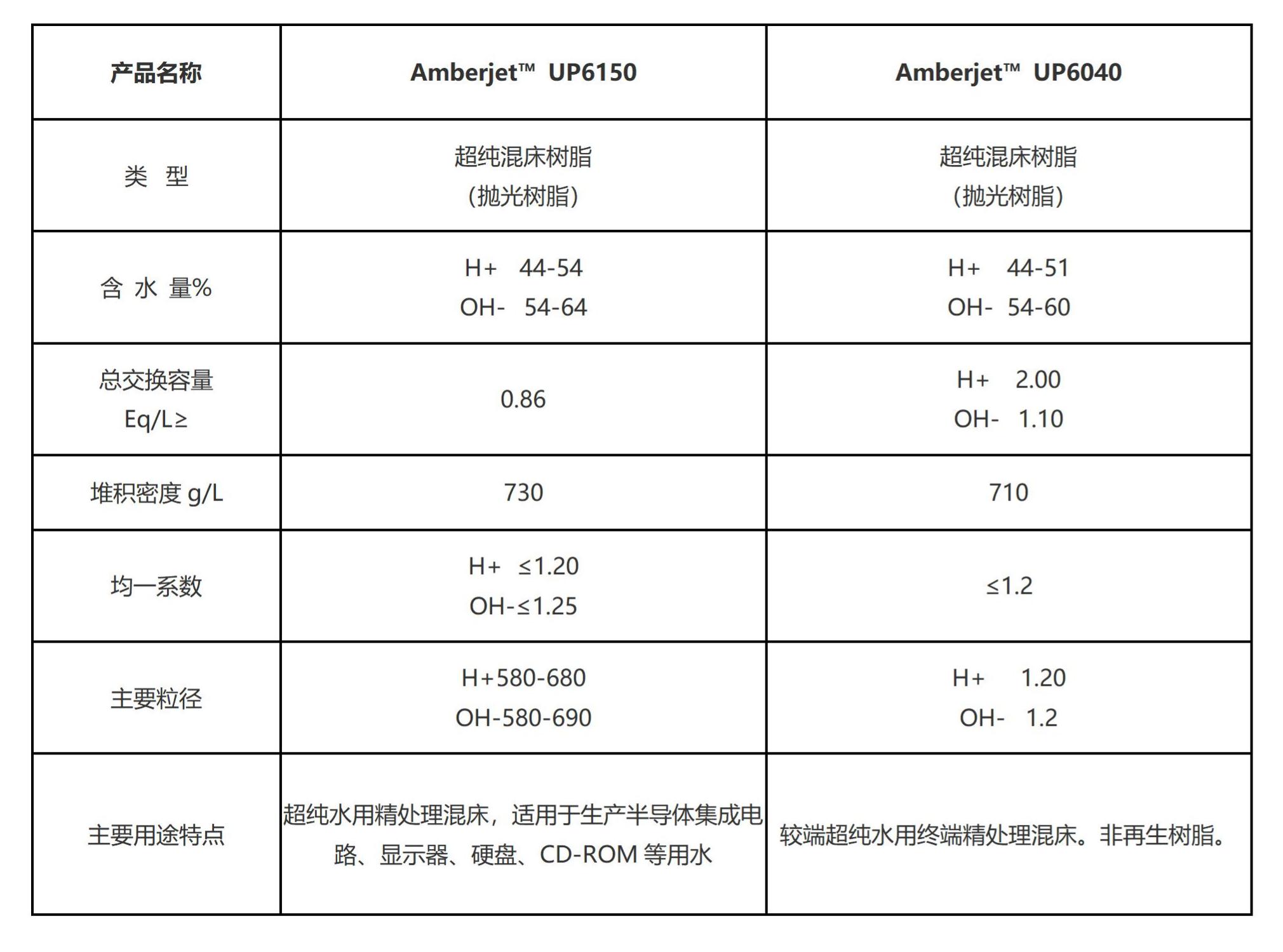 1. AMBERJET UP6150 电子级混床树脂,密度730g/L,均匀系数1.2,能生产18兆欧的高质水树脂,可用于显示设备、精密线路板、离散电子设备、中低密度芯片等电子特殊产品漂洗及芯片切片安装阶段。