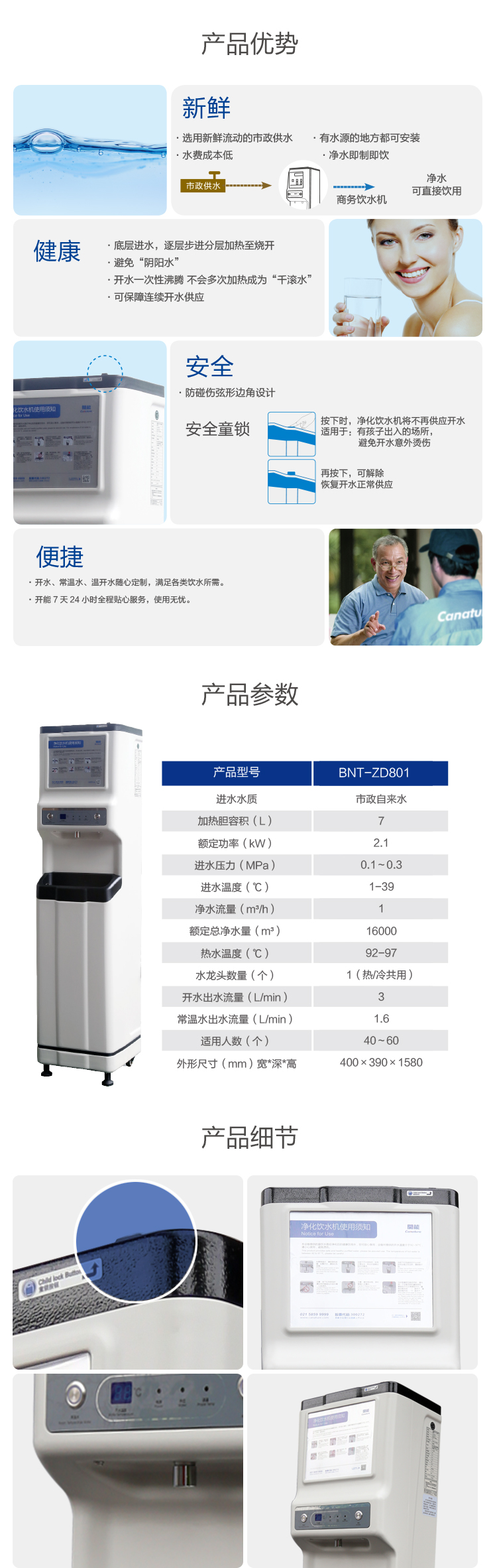◇ 外壳机箱采用整体食品级高强度塑料成型,杜绝机箱结构 腐蚀和涂层老化问题; ◇ 采用反渗透技术,精度达0.0001微米,过滤细菌、重金属、 有机物等水中的害物质; ◇ 采用大流量活性炭、KDF前置过滤结构,有效去除余氯及 重金属。 ◇ 大流量供水,可保证多人同时使用; ◇ 出水水质为高品质纯水,确保安全饮水,口感纯净; ◇ 步进式开水器,杜绝千滚水,保障健康,提高效能; ◇ 可连续提供5.5升开水; ◇ 开水容量适用于40-60人左右的办公室或公共场所